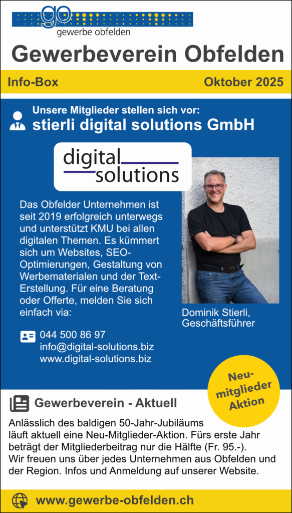 Um unsere Sichtbarkeit zu erhöhen, platzieren wir ab November in der Gewerbe-Zeitung des Affolter Anzeigers monatlich ein Inserat (90×158 mm)in Form einer Info-Box. Darin stellen wir jeweils ein Gewerbeverein-Mitglied mit Logo, Bild, Text und Kontaktdaten vor. Dazu können wir in der Info-Box auch Neuigkeiten aus dem Gewerbeverein veröffentlichen. Ein Beispiel dazu findet ihr nebenan.