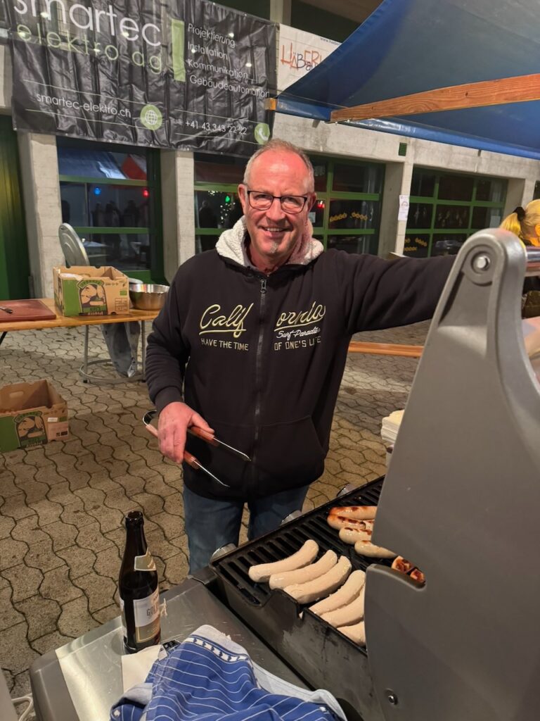 Der Tag begann neblig und endete auch so. Um 17.30 Uhr trafen sich die Vorstandsmitglieder und ein paar helfende Hände auf dem Sportplatz Zendenfrei. Marktstände und Grills standen bereits, jetzt galt es alles bereit für zu machen. Schon um 18 Uhr wurden die ersten Würste bestellt. Gut zwei Stunden später waren über 500 Bratwürste und Cervelats verkauft.