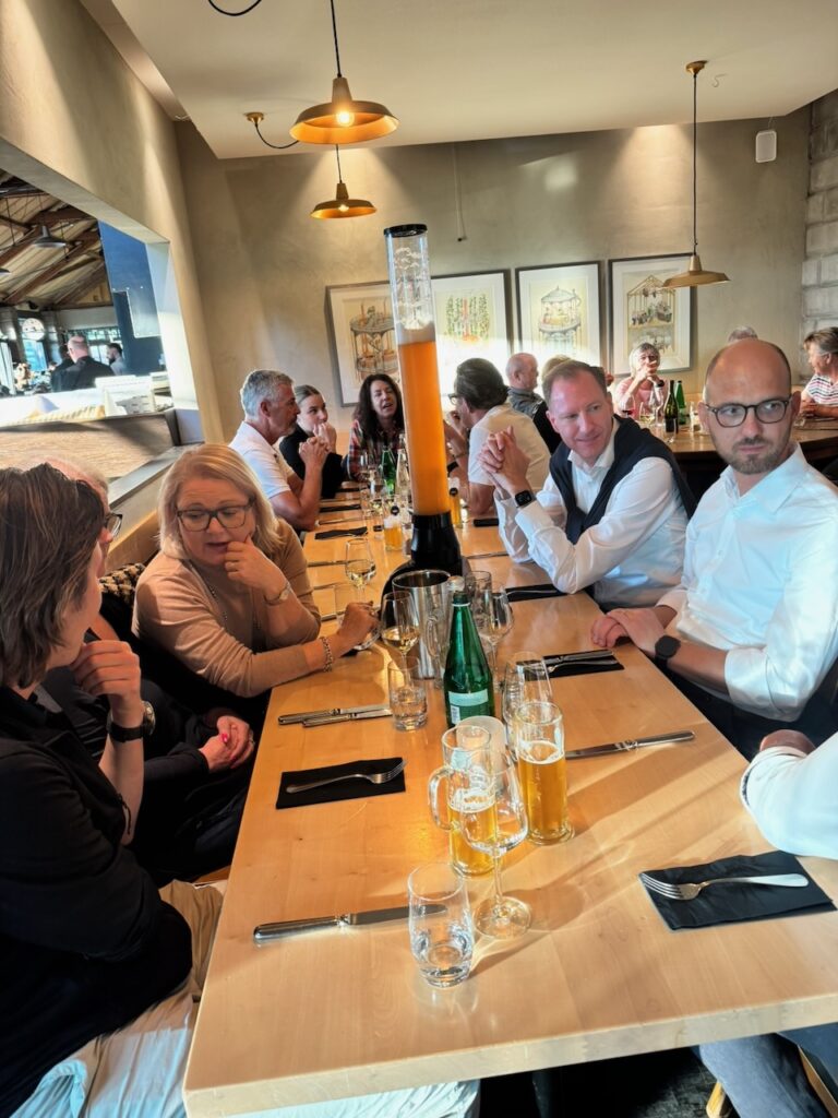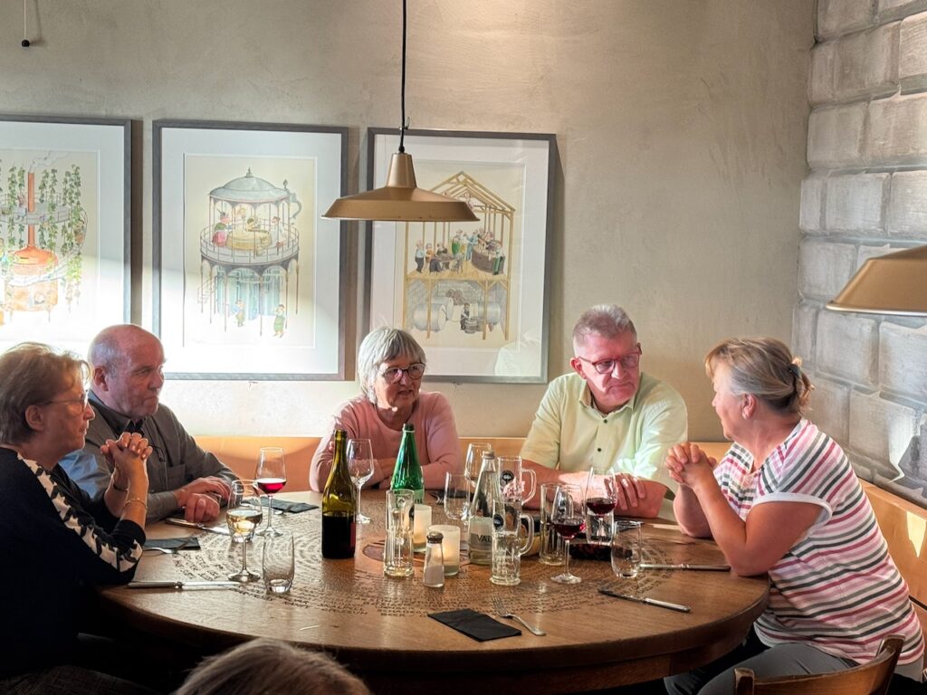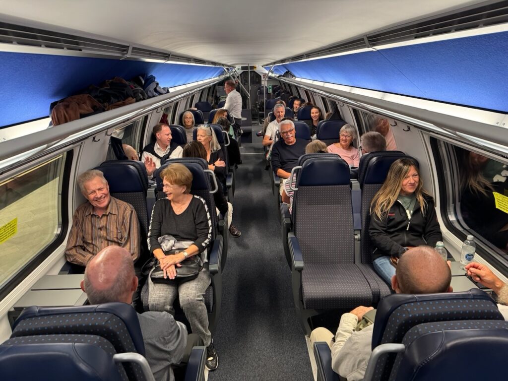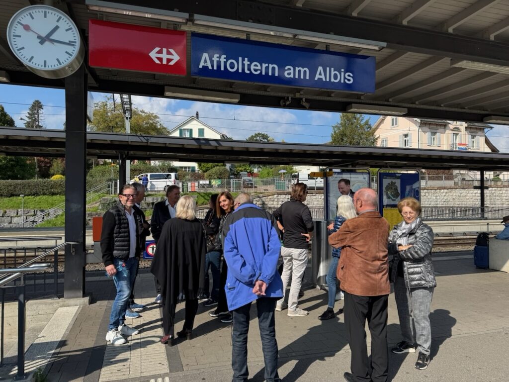 Für die meisten kam dann der fast halbstündige Verdauungsspaziergang zum Bahnhof wie gerufen, wer nicht ganz so pressieren wollte, fuhr mit dem Bus zurück. Im für die Gruppe reservierten Abteil ging es heimwärts. Und aus Angst zu verdursten, kam irgendwo sogar nochmals eine Flasche Wein hervor und wer wollte, gönnte sich einen Schlumi.