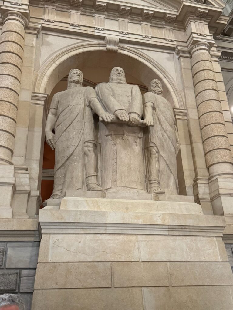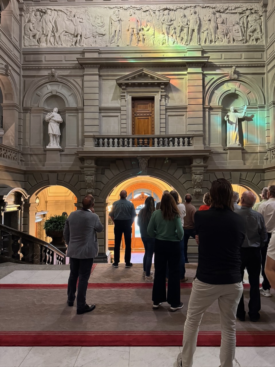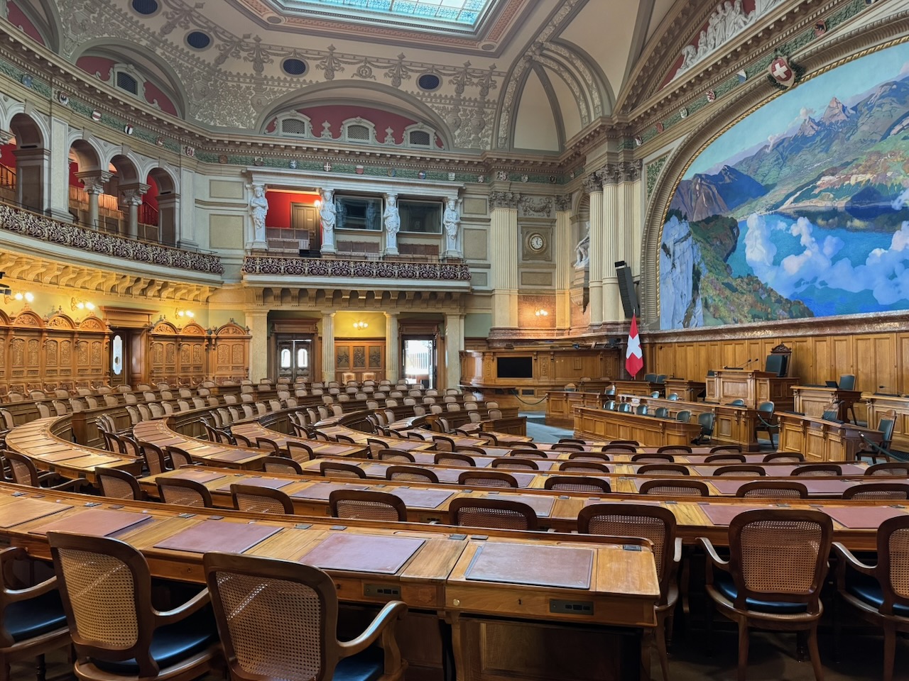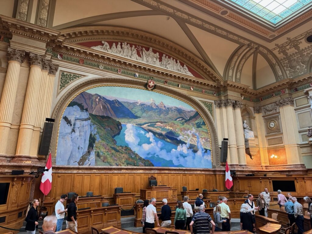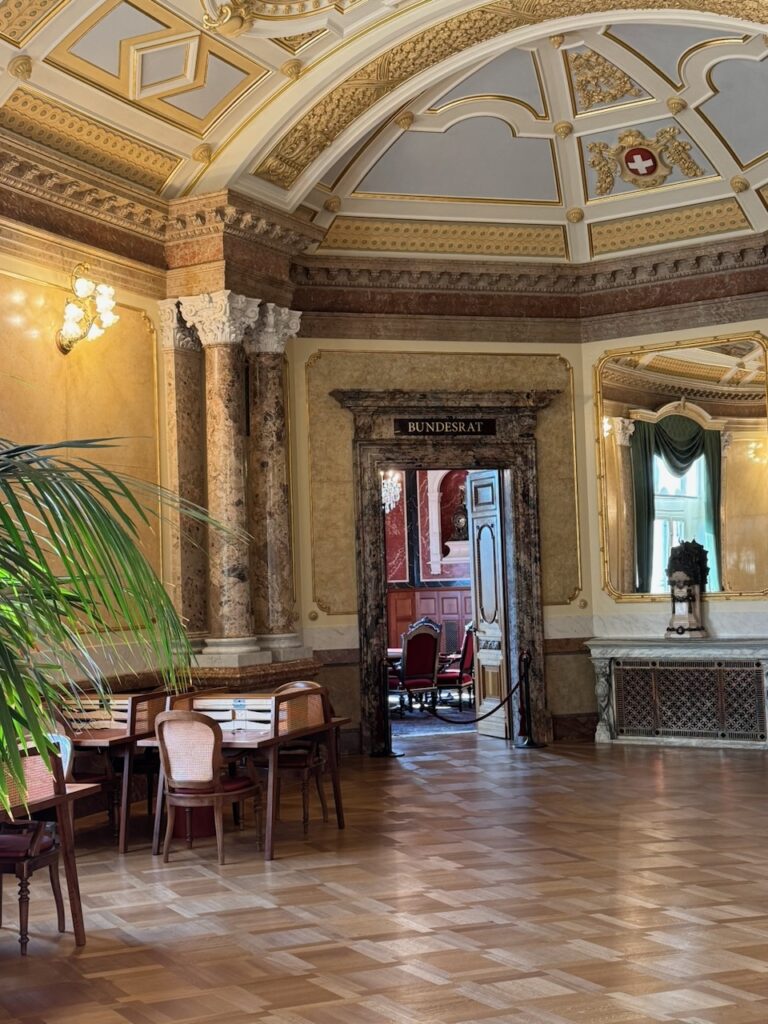 Schlusspunkt des Rundgangs durch das fast menschenleere Gebäude war die Wandelhalle. Auch dort erstaunlich viel Kunst. Viele Deckengemälde bilden hier Geschichtliches der Schweiz ab. Ein Zimmer mit der Anschrift «Bundesrat» zog die Aufmerksamkeit auf sich. Allerdings wurde uns beschieden, dass das Bundeshaus eigentlich Parlamentsgebäude heissen müsste. Die Bundesräte sind in eigenen Gebäuden in der Nähe untergebracht und geniessen hier nur Gastrecht. So diente das Zimmer früher, damit die Bundesräte dort auf Ihren Auftritt im Saal warten konnten. Heute laufe das dynamischer ab. Wenn bereit, wird der Bundesrat per SMS anvisiert und kann dann direkt in den Saal.