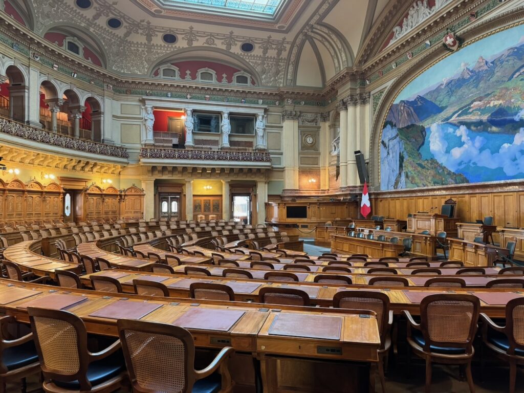 Noch beeindruckender war der Nationalratssaal. Gross, aber nicht so gross wie man es jeweils von den TV-Aufnahmen meinen könnte, war der Saal. Der Kanton Zürich stellt 36 Nationalräte. Unsere Führerin empfahl uns auch mal während der Session reinzuschauen. Dann könne man die Volksvertreter beobachten. Von der Zuschauertribüne habe man guten Einblick und sehe direkt auf die Laptops der Politiker. Da seien jeweils Ferienbilder oder Facebook-Seiten zu entdecken. Auch bei den elektronisch durchgeführten Abstimmungen seien jeweils nicht alle anwesend, was man ja eigentlich erwarten dürfte, so unsere Führerin.