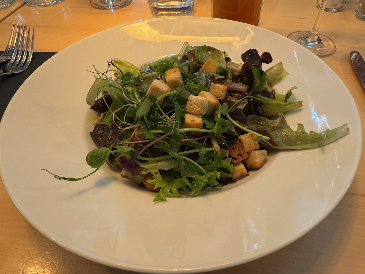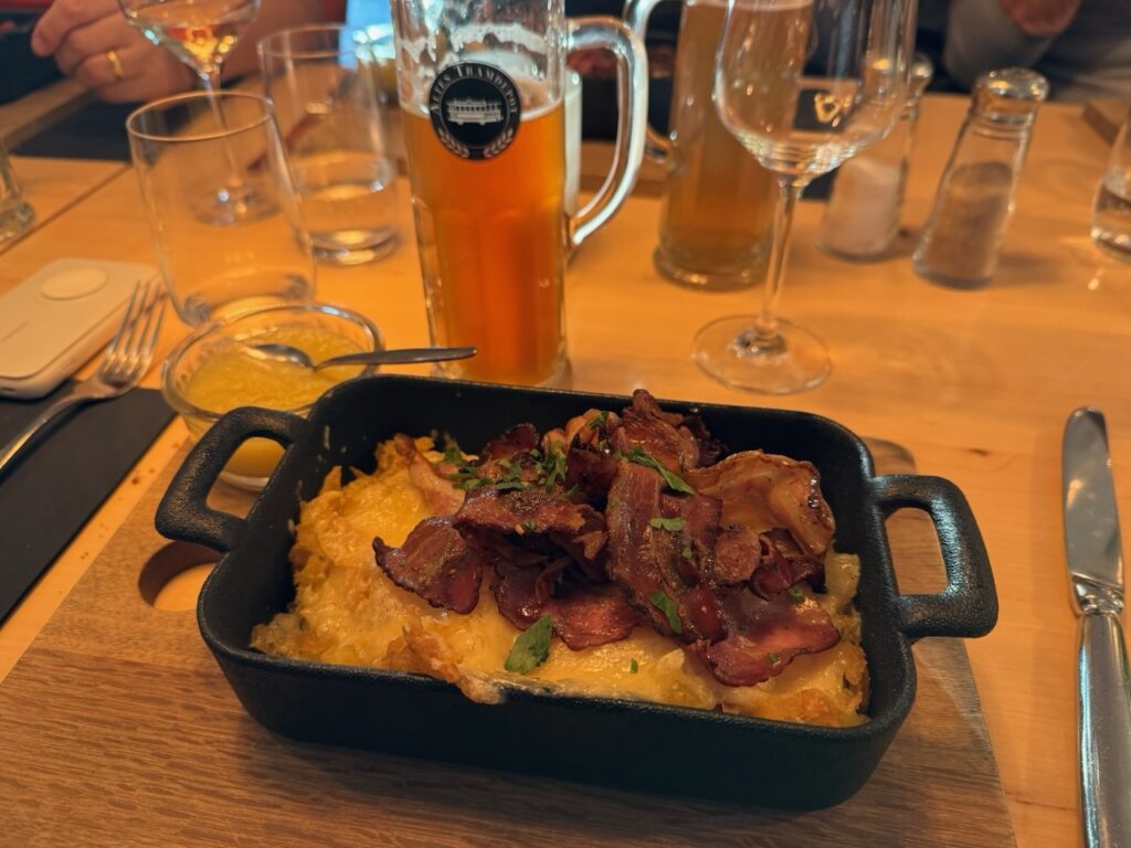 Durstig war man geworden und so kamen die drei Liter Türme mit Bier und Zapfhahn auf den Tischen wie gerufen. Natürlich gab es auch Mineralwasser und Wein. Äusserst zügig wurde der Salat aufgetischt, kurze Zeit weitere drei Liter Türme und danach eine wirklich feine und üppige Portion Rösti, entweder mit Speck und Käse überbacken oder mit Spiegelei und Röst-Zwiebeln.