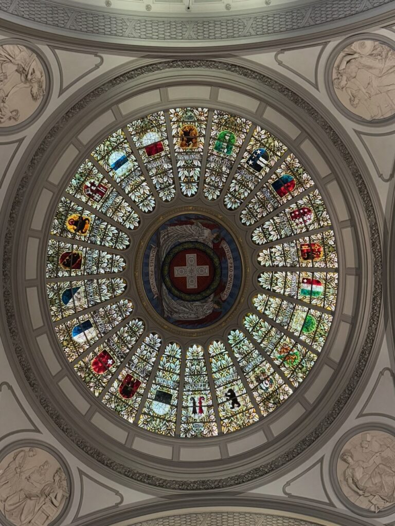 Schliesslich sind in der Kuppel auf über 30 Metern Höhe die Wappen von 22 Kantonen angebracht. Die Rechnung geht soweit auf, dass die Halbkantone jeweils ein gemeinsames Wappen teilen und es den Kanton Jura beim Bau des Bundeshauses noch nicht gab. Denn eingeweiht wurde das Gebäude schon am 1. April 1902. Gebaut wurde es aus 95 % Schweizer Materialien. In den Jahren 2006 bis 2008 wurde es für 100 Millionen Franken umfassend renoviert.